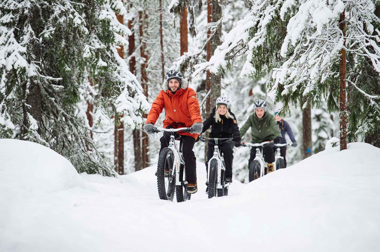 Fatbikes come in a good range of frame sizes, so anyone 155 cm or taller can find a suitable ride. If you’re shorter than 155 cm, we recommend visiting Bliss Adventure & Rental to test our S-size fatbike before your tour or rental. We use high quality cycling helmets for safety. A balaclava, or alternatively a simple woolen hat, is recommended underneath for warmth. Ski gloves or mittens will keep the cyclist’s fingers warm. Any winter-suitable outdoors shoe will work well in fatbiking, too.