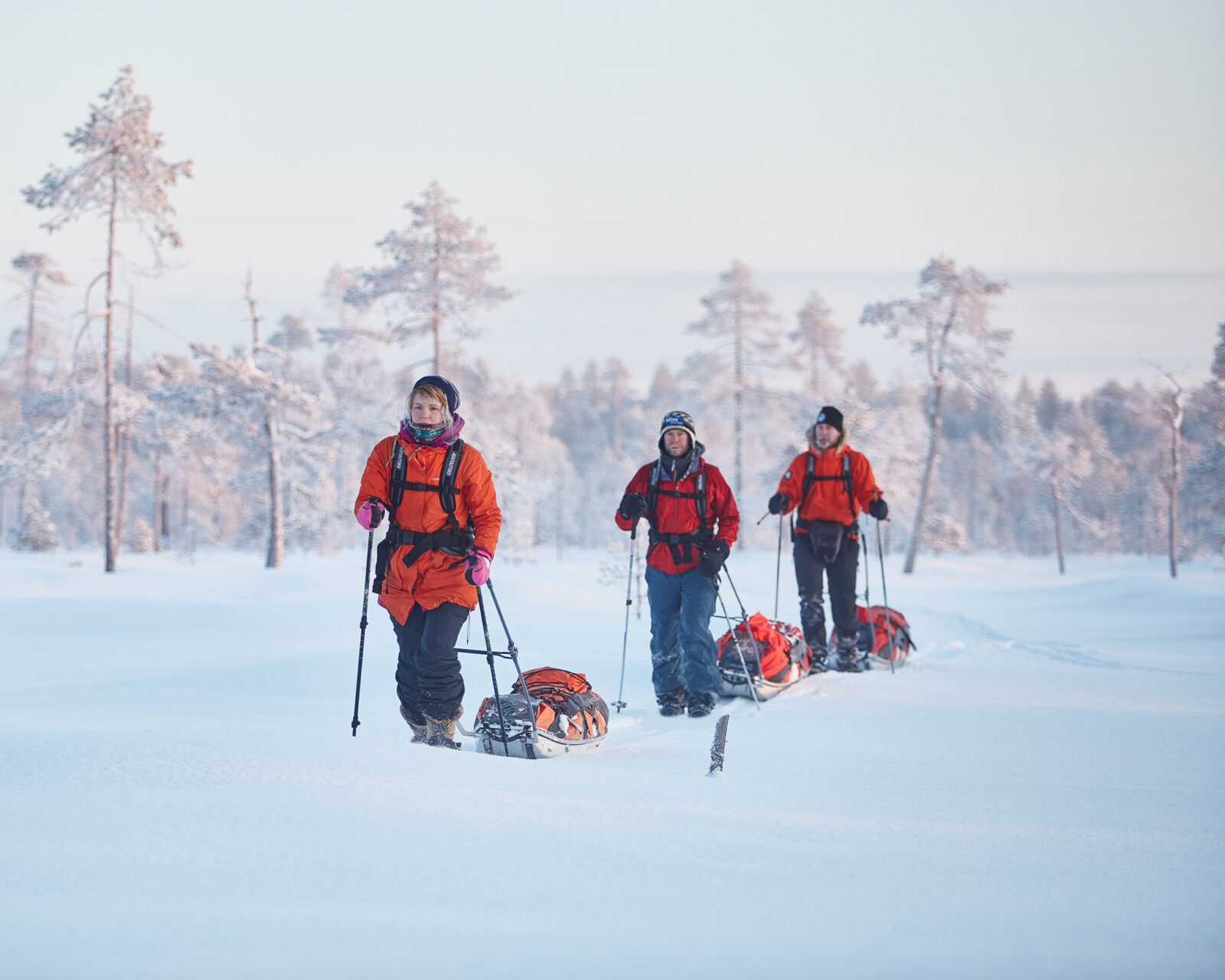 Entry-level overnight snowshoe tour to Rykimäkuru Gorge and beyond in Pyhä-Luosto National Park. A qualified wilderness & snowshoeing guide will lead the tour and share his/her knowledge about the surrounding nature and wilderness travel tradition. Snowshoers will pull not-so-heavy ahkio sled (also called often pulka) for their personal equipment, which adds the right kind of spirit (and therefore, a day backpack is not necessary for this tour).