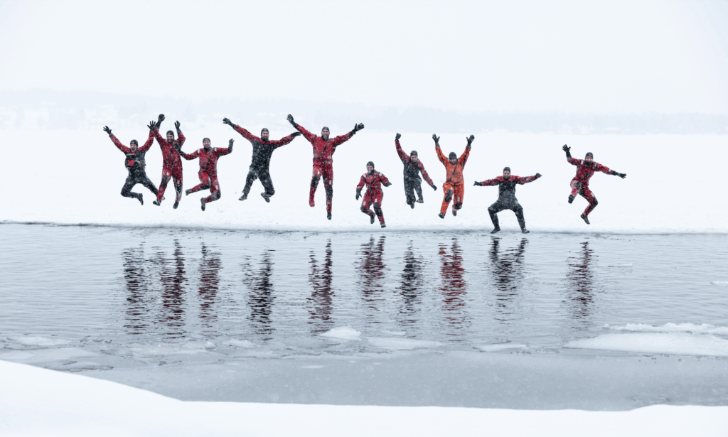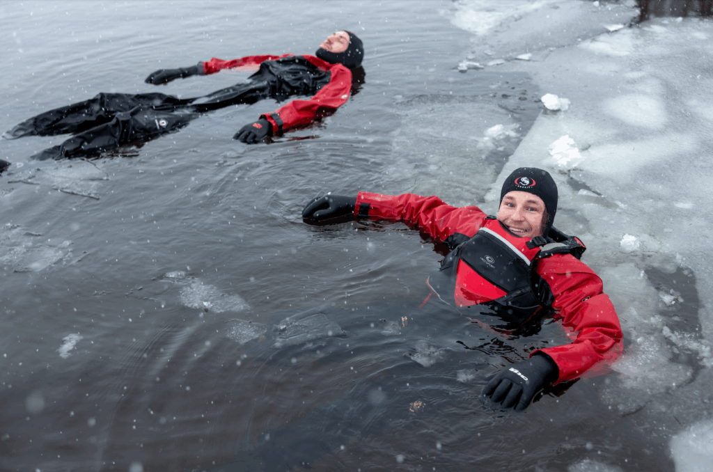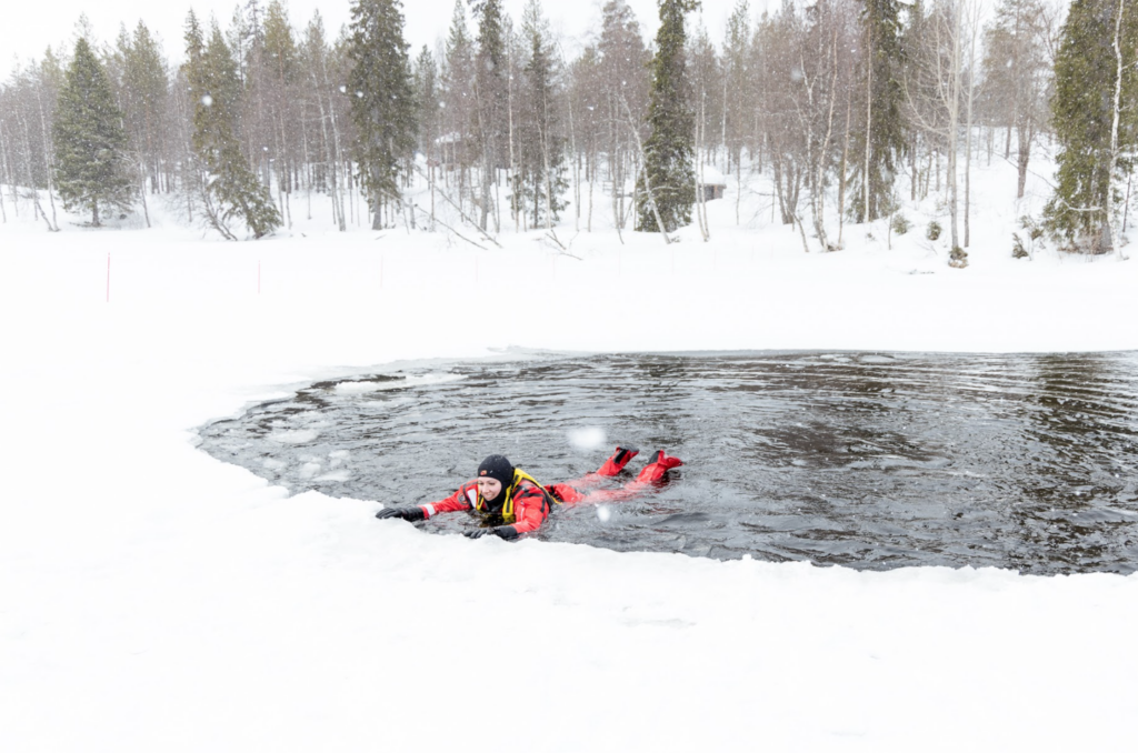 We will first give you a dry suit and help you in dressing up. Once we are dressed, we will give you instructions and then you can step into the water. You can enjoy being supported by water in a frozen lake. You can observe the nature, the quietness around and your own sensations.