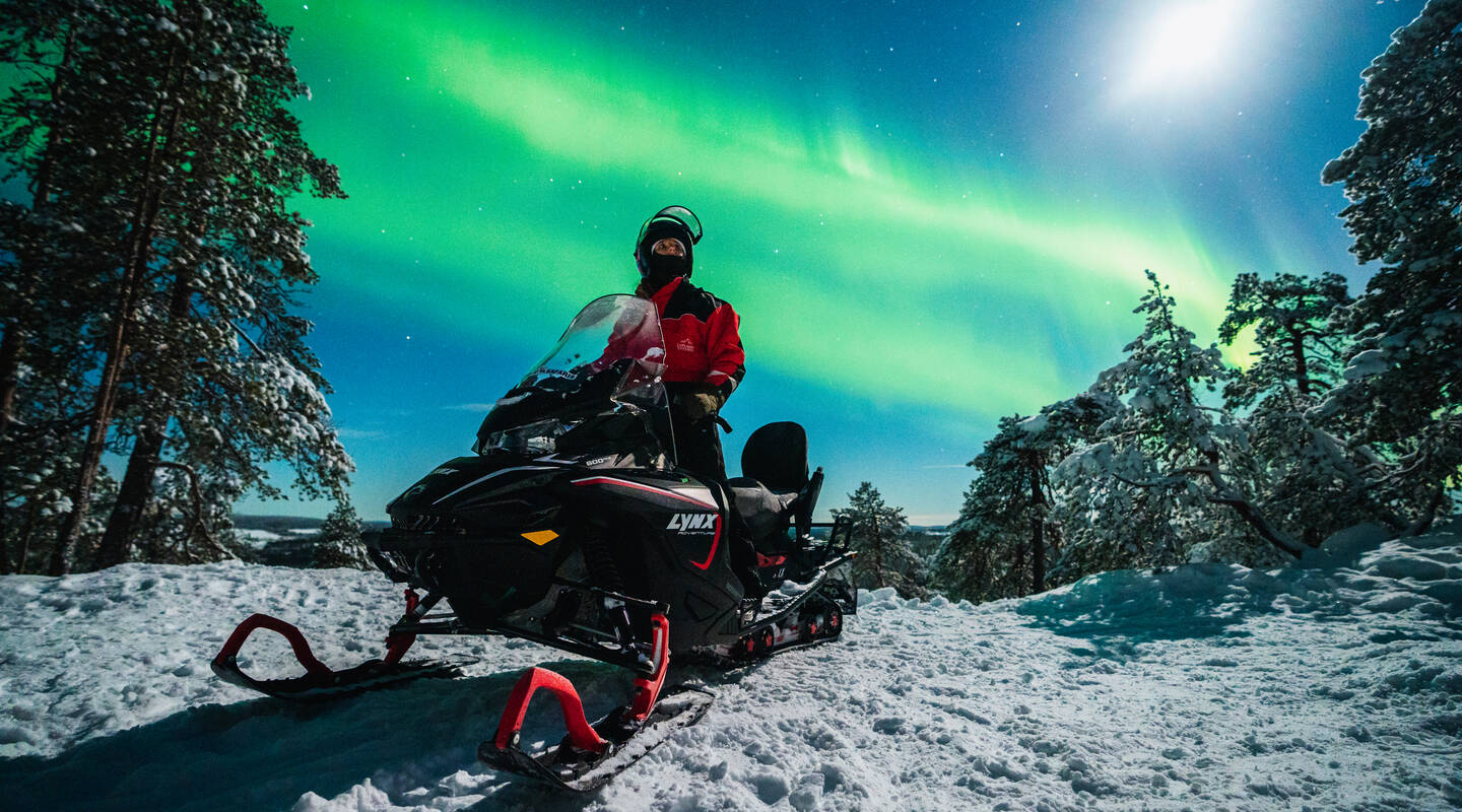Scan the arctic night sky with silent and emission free electric snowmobile.
